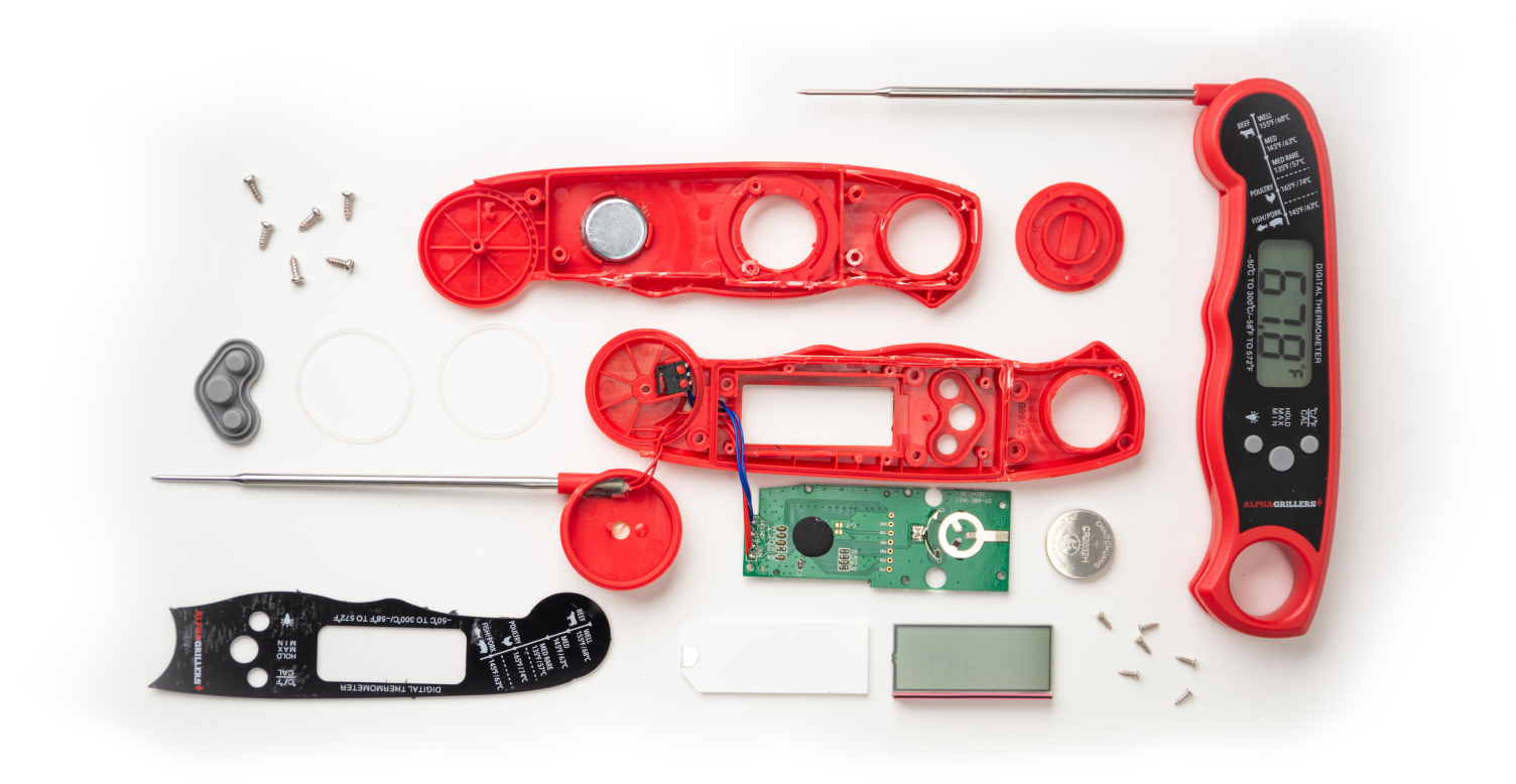 Firefly uses a clock spring and latch mechanism to easily extend the probe at the press of a button, even while wearing an oven mitt.